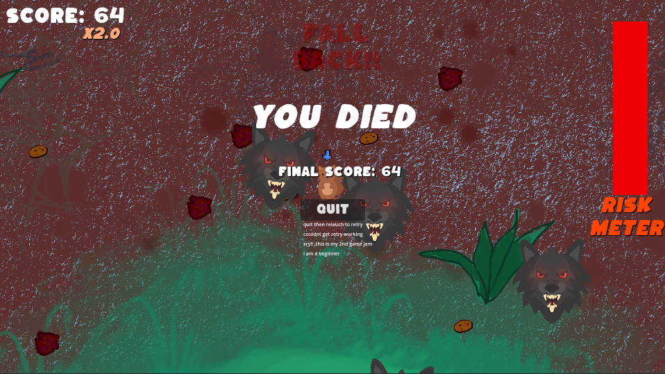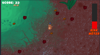 You are a small squirrel wandering through a dangerous Desolated wasteland in search of buiscuits, the more you get greedy the more risk you have to handle